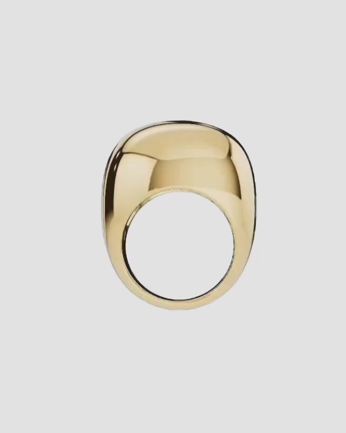 This ring is crafted from gold-coated brass. The shape is a heavy, rounded square with a mirror-like finish that emphasizes its clean lines. This piece acts as an anchor; wear it alone or use its structure to ground any layered combination.