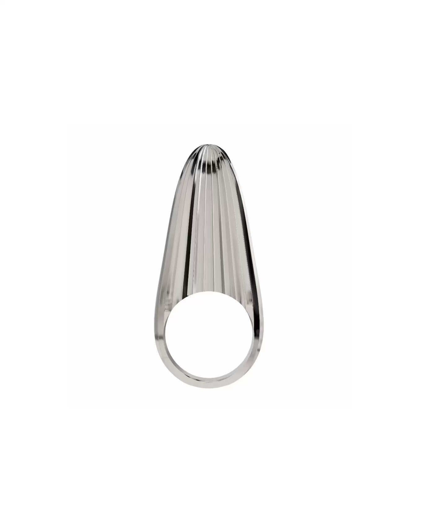 An architectural ring made completely of high-polish sterling silver. The form is a sculptural cone shape that points upward, detailed with sharp, textured ridges. This piece showcases static power; wear this angular form when pure structure is the main element.