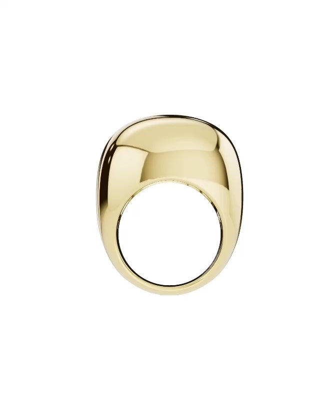 This ring is crafted from gold-coated brass. The shape is a heavy, rounded square with a mirror-like finish that emphasizes its clean lines. This piece acts as an anchor; wear it alone or use its structure to ground any layered combination.