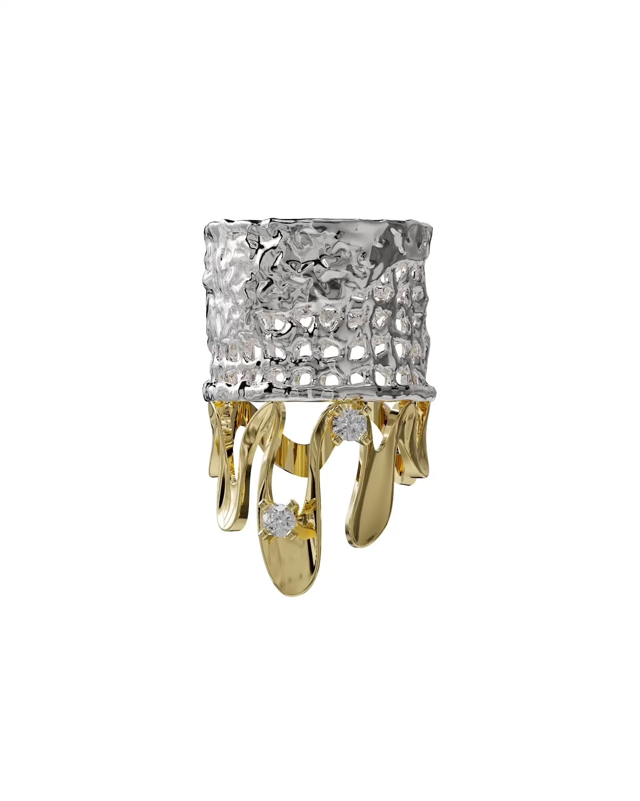 This piece is engineered to look like a complete stack. It is crafted from gold-plated brass and sterling silver, with crystals set into the metal. The gold element flows in an asymmetrical wave beneath the silver base. An instant statement; this is the singular, ready-made focal point.